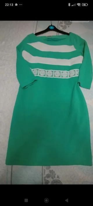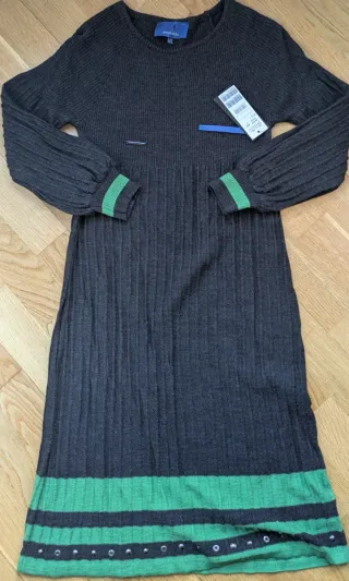 Vestido de punto de la marca Anna Mora. - Diseño de manga larga. - Puños y bajo con detalles de rayas verdes. - Adornos metálicos en el bajo.