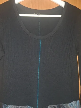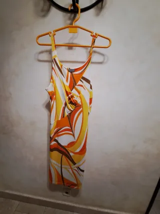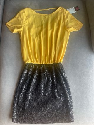 Vestido con etiqueta, sin estrenar. Combina un cuerpo amarillo con una falda negra adornada con lentejuelas. - Cuerpo de gasa ligera. - Falda con diseño de lentejuelas mate. - Cierre de cremallera lateral. - Preciosa espalda drapeada con tira en la parte alta. - tiene goma interior en la cintura, lo que hace que siente aún mejor. comprado en boutique por 155€. Lo vendo en 65€ porque urge
