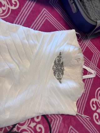 Elegante vestido de novia con un diseño drapeado y un detalle de pedrería. - Diseño drapeado en el corpiño. - Adorno de pedrería en la cintura. - Tirantes finos.