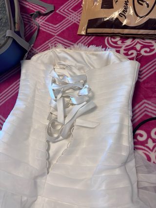 Conjunto de vestido y tocado a juego. - Vestido de encaje con detalle de volantes en el bajo. - Tocado floral con perlas y plumas.
