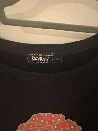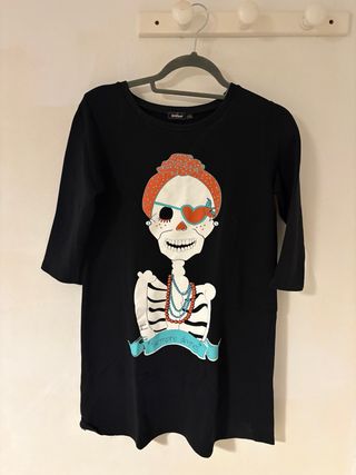 Vestido negro con un divertido estampado de calavera. - Diseño con gafas de corazón y collar. - Detalle de texto sempre divine en la parte inferior. - Mangas de tres cuartos.