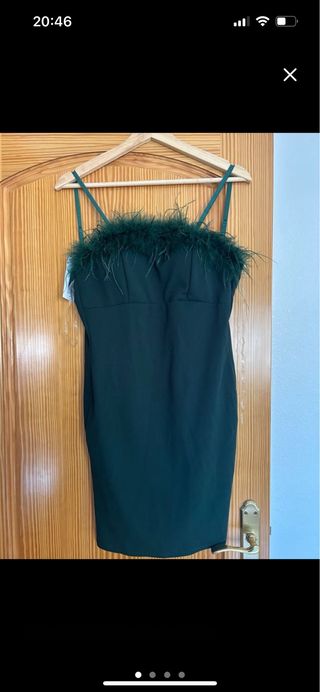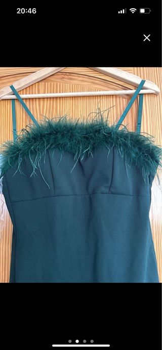 Vestido corto con detalle de plumas en el escote. - Diseño de tirantes finos. - Acabado con plumas en la parte superior.