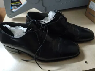 Elegantes zapatos de vestir para hombre, fabricados en piel. - Diseño clásico. - Cierre con cordones. - Suela resistente. Se entregan en su caja original, estupendamente conservados. Tienen 2 puestas. Son talla42 pero grandes, por eso indico que equivalen a una talla 43.
