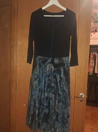 Vestido midi de la marca Desigual con un diseño orihinsl - Cuerpo superior de punto negro. - Falda plisada con estampado abstracto en tonos azules y negros. - Detalle de costura en contraste en la parte delantera.