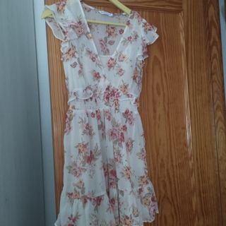 Vestido vaporoso de Stradivarius con estampado floral. - Tejido de gasa ligero. - Cintura elástica fruncida. - Volantes en mangas y bajo. Puesto una vez,con vestido de punto color piel debajo,queda muy bonito.