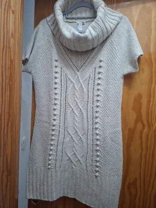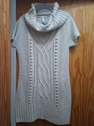 Vestido de lana con un diseño elegante y moderno. Perfecto para añadir un toque de estilo a tu armario. - Tejido de lana suave y confortable. - Manga corta. - Cuello alto tipo cowl. - Detalle de trenzas en el centro. - Adornos de bolitas a los lados.