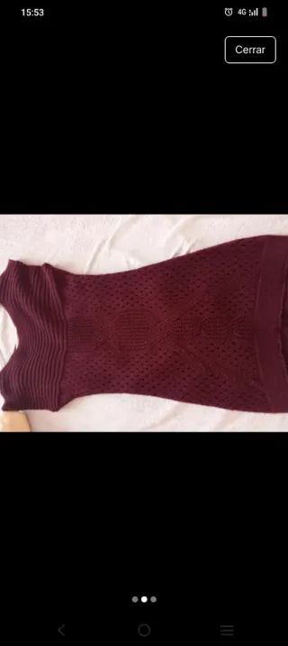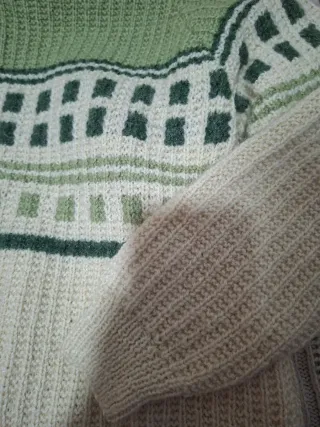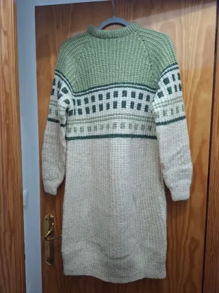 Vestido de lana tejido a mano con un diseño de rombos y rayas en la parte superior. - Diseño de rombos y rayas en la zona del pecho y mangas. - Tejido de lana suave y cálido. - Largo hasta la rodilla.
