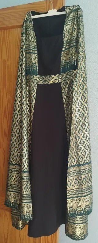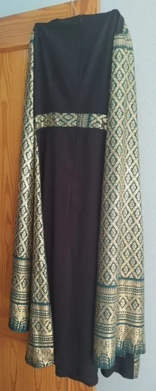 Elegante vestido largo con detalles en tela brocada. Mangas abullonadas y cuello cuadrado - Tejido principal negro. - Paneles decorativos en verde con estampado dorado. - Cinturón a juego.