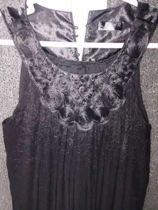 Elegante vestido negro de la marca Lea TU, perfecto para ocasiones especiales. - Adorno floral en el cuello. - Tejido con textura brillante. - Diseño sin mangas. - Bajo con detalle de encaje.