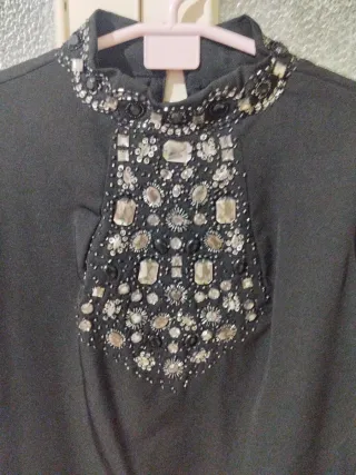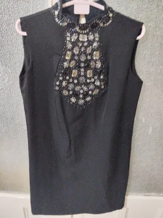 Elegante vestido sin mangas de la marca Derhy. Presenta un llamativo detalle de pedrería y abalorios en el cuello y la parte delantera. - Cuello alto con adornos. - Diseño sin mangas. - Detalle de pedrería y abalorios en forma de V.