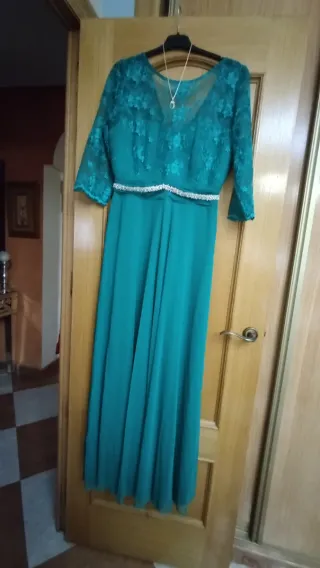 Elegante vestido de fiesta largo. - Diseño con drapeado en la cintura. - Mangas largas de encaje. - Escote redondo.es 54 pero da ,46,48