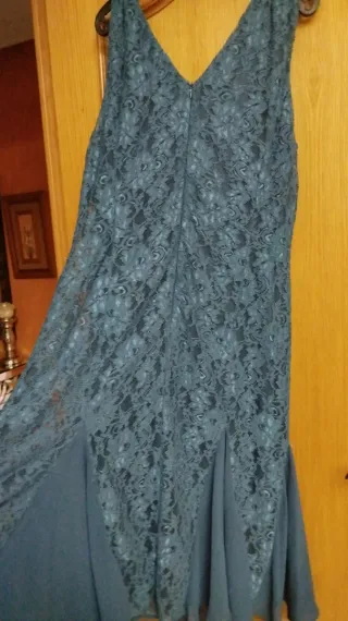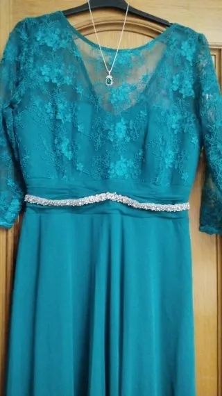 Elegante vestido de encaje en tono azul verdoso, ideal para ocasiones especiales. Incluye un llamativo tocado a juego. - Diseño de encaje intrincado. - Mangas de tres cuartos. - Tocado con plumas y detalles de pedrería.