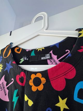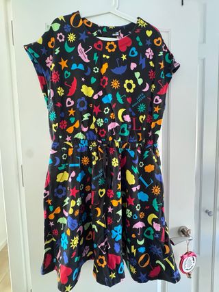 Vestido de manga corta con un divertido estampado de iconos. - Estampado de soles, lunas, estrellas, paraguas, corazones y flores. - Cintura ajustable con cordón. - Diseño vibrante y alegre. - Dos bolsillos laterales