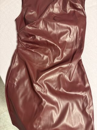 Vestido de corte ajustado con detalle de drapeado. - Material: Cuero sintético. - Color: Burdeos. - Diseño sin mangas. - Drapeado lateral.