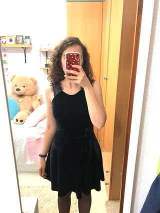 Vestido negro de Nochevieja talla M de Tintoretto, de terciopelo con detalles de encaje en la espalda y tirantes. Es ideal para ocasiones especiales, además, tiene un tejido suave y una falda con caída y cuerpo. Sus materiales son: poliéster y elastano para el vestido y, poliéster para el forro. Ha sido usado en una sola ocasión por lo que se encuentra en perfecto estado.