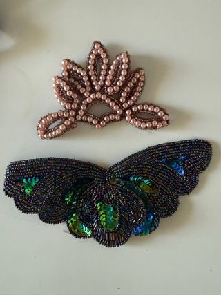 Conjunto de aplicaciones costura para vestidos de ceremonia, adornadas con pedrería. Aplicaciones vestido ceremonia pedrería - Diseño floral en tonos rosados. - Adorno tipo abanico con lentejuelas y pedrería en tonos verdes y azules.