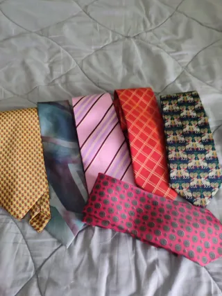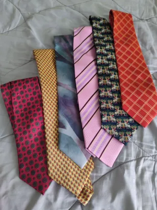 Conjunto de seis corbatas con diferentes diseños y colores. - Corbatas de seda y poliéster. - Diseños variados: cuadros, rayas, estampados. - Ideales para ocasiones formales y eventos.