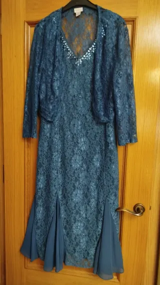 Conjunto de vestido y chaqueta a juego, ambos confeccionados en encaje. - Diseño elegante. - Detalles brillantes en el escote del vestido. - chaqueta. - Aberturas en la falda del vestido.