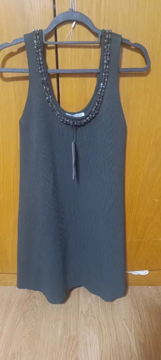 Vestido de Zara con un diseño elegante y detalles de pedrería en el cuello.vosto 60 euros - Color gris. - Cuello adornado con pedrería. - Tejido de punto.