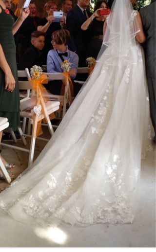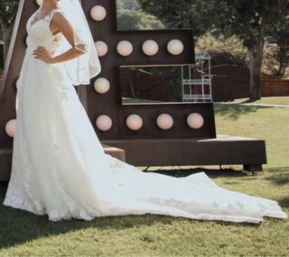 Vestido de novia Pronovias, elegante y con un diseño espectacular. - Encaje floral en el cuerpo y la cola. - sobrefalda para tener dos vestidos en uno. - Gama atelier. - Precio en tienda 6.500€