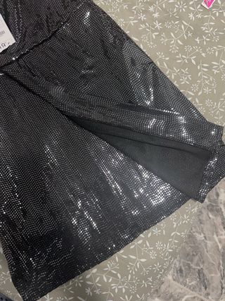 Vestido corto con efecto brillante, ideal para eventos o salidas. - Diseño asimétrico. - Tejido con lentejuelas plateadas. - Tirantes finos.