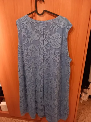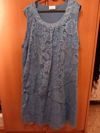 Conjunto de cinco prendas de vestir. - Vestido gris con cremallera frontal. - Vestido calentito azul con botones. - Vestido de lana negro sin mangas, sujeción al pecho - Top brillantes atado a cuello y espalda con cadena plateada. Con etiqueta - Camisa semitransparente con hombros abiertos y atadura al cuello. Queda preciosa puesta