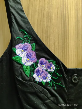 Vestido de manga larga con un diseño floral bordado y con abalorios en la parte delantera y en las mangas. Presenta un volante en la parte inferior. - Bordados florales multicolores. - Cuello redondo. - Manga larga. - Volante en el bajo.