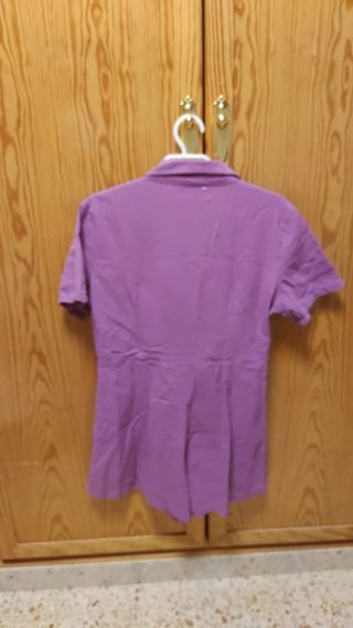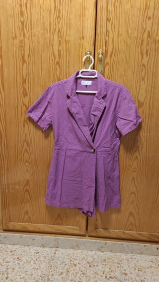 Vestido de manga corta con pantalón debajo. El pantalón lleva cremallera y lleva un botón interno para que se quede fijo el escote en pico. Queda muy bonito y es cómodo. Muy poco uso y en muy buen estado. Talla M de Lefties, color morado. Tiene un diseño elegante y favorecedor.