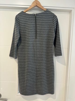 Vestido de manga tres cuartos con un diseño de rayas finas. - Tejido suave y cómodo. - Corte recto. - Cuello redondo.