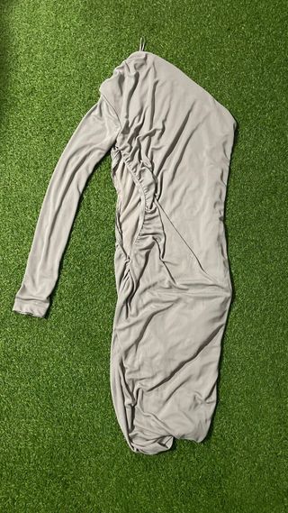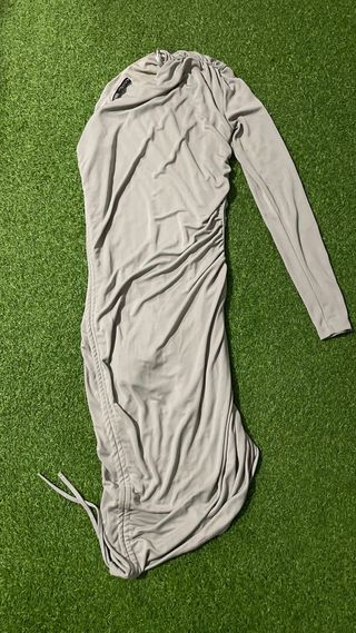 Vestido largo de manga larga con detalle fruncido a un lado y cordones ajustables en el bajo. - Diseño drapeado. - Tejido suave y elástico. - Cuello redondo.