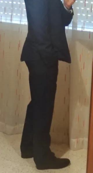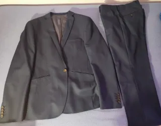 Traje de dos piezas en color azul marino, ideal para climas cálidos. - Chaqueta con un botón. - Pantalón de vestir.
