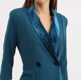 Elegante vestido de la marca Rinascimiento. - Diseño tipo blazer. - Cuello con solapa de terciopelo. - Cierre cruzado con botones. - Manga tres cuartos.