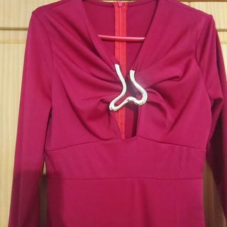 Vestido de corte ajustado con un diseño moderno y elegante. - Color rosa vibrante. - Detalle de perlas en forma de corazón en la zona del escote. - Mangas largas acampanadas. - Tejido con fruncidos laterales para un ajuste favorecedor.