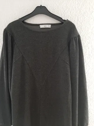 Es un vestido en color gris con rayas pequeñas, en la talla XS, de mango, en perfecto estado.