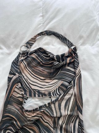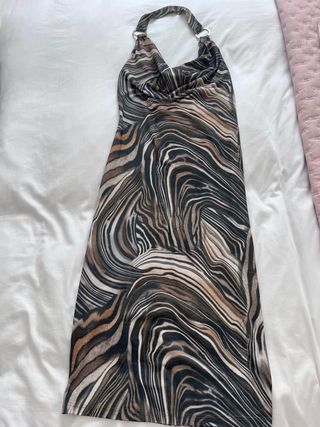 Vestido a media pierna con un llamativo estampado inspirado en la cebra. Su diseño halter con anillas metálicas le da un toque moderno. - Diseño halter con anillas metálicas. - Estampado de cebra en tonos marrones y beiges. - Corte largo y fluido.