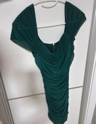 Elegante vestido verde con un diseño drapeado. - Tejido ligero y fluido. - Escote asimétrico. - Detalle de fruncido en la falda.