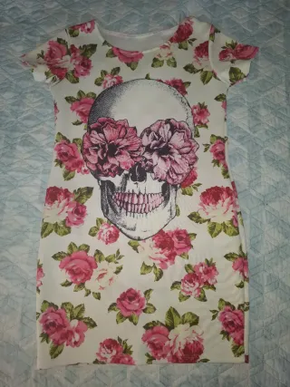 Vestido de manga corta con un llamativo estampado. Da para S/M/L. Usado una vez - Diseño de calavera con flores. - Estampado floral de rosas. - Mangas cortas.