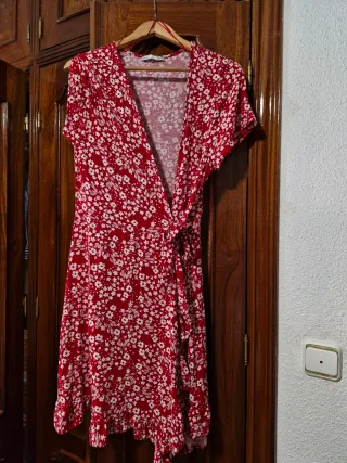 Vestido de Lefties con un bonito estampado floral en tonos rojos y blancos. Ideal para cualquier ocasión. - Diseño cruzado con lazada. - Manga corta. - Volante en el bajo.