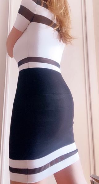 Vestido ajustado con diseño de rayas. - Diseño de rayas horizontales en blanco y negro. - Detalles de tejido de malla en las rayas. - Largo hasta la rodilla.