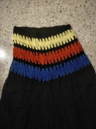 Vestido de playa con un diseño único y llamativo. - Parte superior con tejido de crochet en negro, amarillo, rojo y azul. - Falda larga negra con capas asimétricas. - Detalles de costuras finas en amarillo y rojo.
