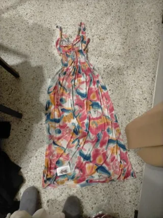 Vestido largo con un estampado vibrante y alegre. - Diseño con tirantes finos. - Cintura elástica para un ajuste cómodo. - Falda fluida y vaporosa.