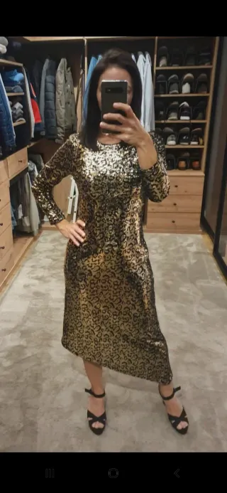Vestido de lentejuelas con estampado animal print. - Diseño de manga larga. - Largo asimétrico hasta la rodilla. - Cierre con cremallera oculta en la espalda. -Talla S -Marca Sfera