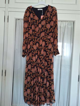 Vestido largo con un bonito estampado floral en tonos tierra y rosa sobre fondo negro. Ideal para ocasiones especiales. - Marca NAFNAF - Talla 40 - Nuevo sin estrenar, conserva la etiqueta