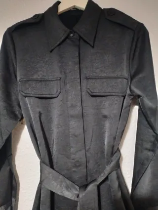 Vestido de corte midi con botones delanteros y mangas abullonadas. - Diseño con cuello en V. - Bolsillos laterales. - Cierre de botones. - Tejido efecto piel. -Talla xs Aprecio un pequeño desperfecto del tejido a nivel de un hombro provocado por un doblez en la perchas, por lo demás está en perfecto estado ✅️