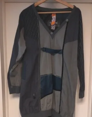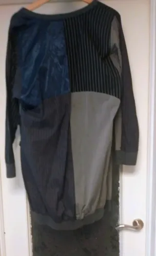Vestido de la marca Desigual con un diseño patchwork único. - Combinación de paneles en diferentes tonos de gris y azul. - Mangas largas. - Cuello en V.