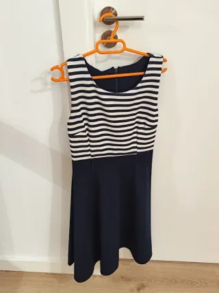 Vestido de verano con un diseño a rayas blancas y azul marino en la parte superior y falda lisa. Usado solo una vez - Diseño a rayas en el corpiño. - Falda de corte amplio.