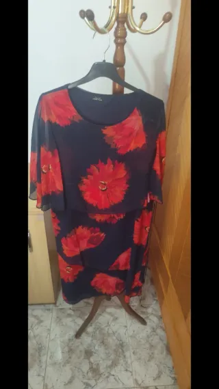 Vestido combinado color negro y estampado rojo y negro, escote redondo, manga 3/4 con abertura y cremallera en la parte posterior. Sin forro interior. Talla 46. Solo un uso. Medidas Hombros 42 cm Sisa a sisa 53 cm Manga 47,5 cm Cintura 53 cm Cadera 56 cm Largo 95 cm