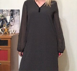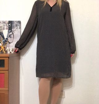 Vestido Cortefiel, color negro con topos blancos, escote en V con ribete, manga larga con ribete, trabillas de cordon para cinturon y forro interior. Tejido de gasa. Talla M. Dos o tres usos. Composicion 100% Poliester Medidas Sisa 52 cm Cintura 53 cm Cadera 55 cm Largo 95 cm