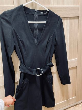 Vestido de Zara con un diseño elegante y moderno. Es mana larga y mini - Confeccionado en ante. - Color negro. - Cinturón con hebilla metálica. - Bolsillos laterales.