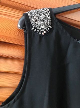 Vestido negro sin mangas con detalles de pedrería en los hombros. - Adorno de pedrería plateada y cristal en los hombros. - Diseño elegante y moderno. Elastico en la cintura